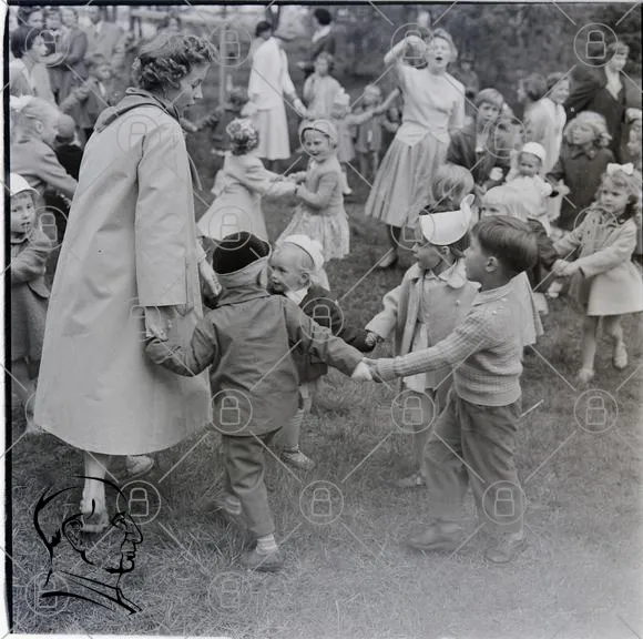 barn, lek, cirkel, gräs, vuxen, fest, kläder, 1950-tal, glädje, samvaro, tradition, utomhus, dans, barnkläder, historisk, svartvit, familj, gemenskap, skratt, aktiviteter, barnens dag, skola, sommar, minnen, nöje, hand i hand, barnens lekar, festligheter, glädjespridare
