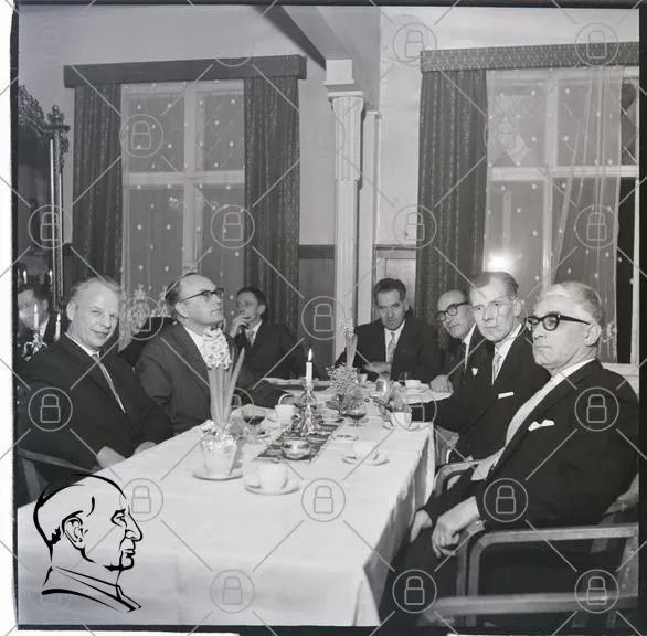 middag, män, kostym, bord, kaffe, te, blommor, fönster, samtal, 1950-tal, fest, sällskap, glasögon, dukat bord, inomhus, eleganta kläder, ljus, dekoration, vänskap, samvaro