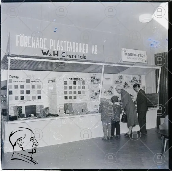 Förenade, Plastfabriker, AB, W&H, Chemicals, utställning, färgprover, material, besökare, kvinna, man, barn, 1960-tal, industri, design, plast, produkter, skyltar, monter, mässa, retro, svartvitt, historia, företag, handel, information, presentation, detaljer, text