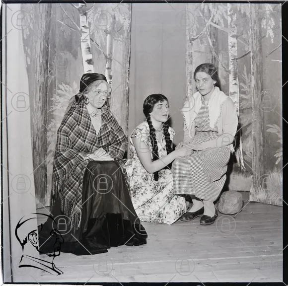 tre kvinnor, teater, kostymer, svartvitt, skådespel, scen, träd, natur, traditionell, kläder, 1900-tal, dramatiskt, porträtt, interaktion, folkloristisk, rekvisita, sittande, uttryck, miljö, bakgrund, vintage, kultur, historia, konst, kvinnlig, samspel, scenografi, folkliv, skådespelerskor, gammaldags