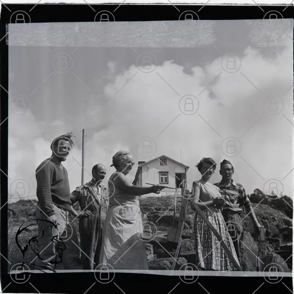svartvit, foto, människor, landskap, hus, kläder, verktyg, utomhus, 1950-tal, samling, familj, tradition, arbete, natur, himmel, moln, generationer, kultur, historia, porträtt, gemenskap