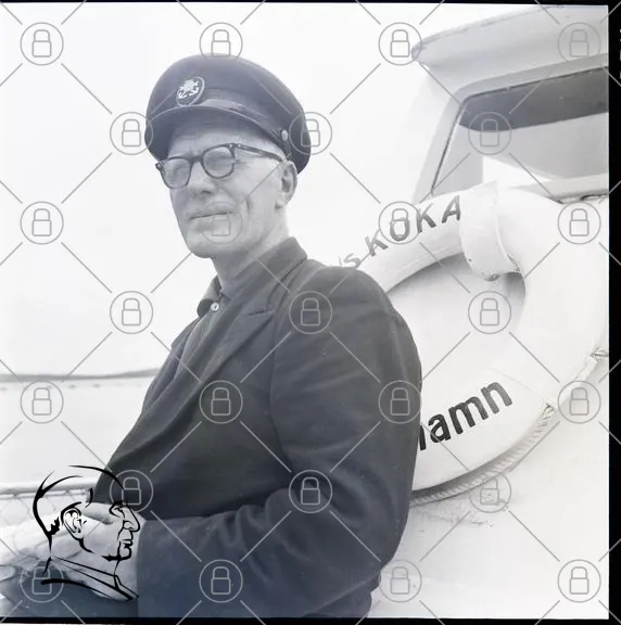 man, sjöman, båt, livboj, glasögon, hatt, svartvitt, fotografi, kust, hav, maritim, uniform, skägg, ansikte, historia, 1900-tal, sjöfart, kapten, tradition, sjöfartshistoria, svensk, sjö, hamn, arbetskläder, nostalgi, porträtt