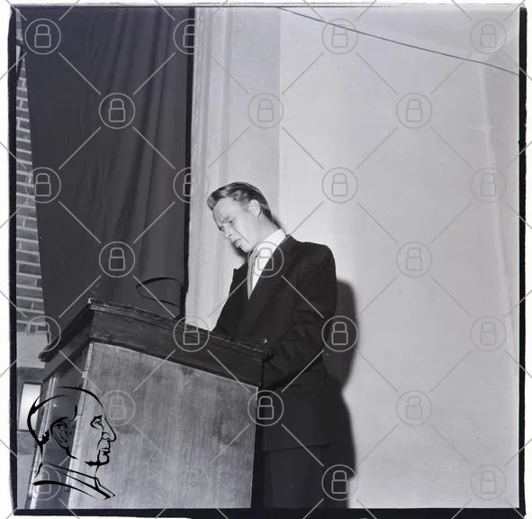 man, talare, podium, kostym, mikrofon, scen, inomhus, svartvit, formell, presentation, vägg, gardin, skugga, stående, evenemang