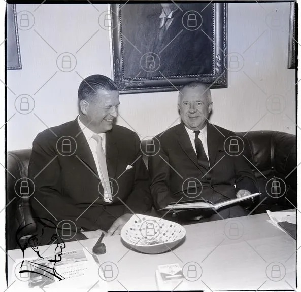 historisk, svartvit, porträtt, män, kostymer, leende, möte, bord, bok, skålar, väggkonst, 1900-tal, affärsmän, fotografi, dokument, tidningar, inomhus, interiör, vänskap, diskussion