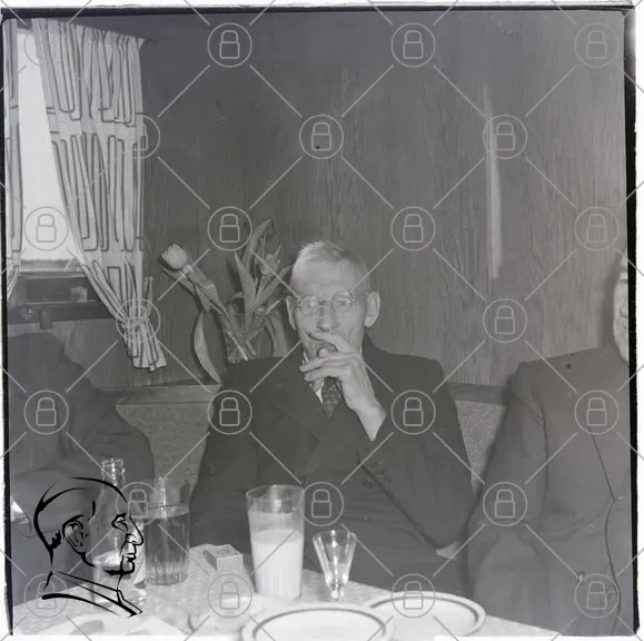 svartvitt, foto, män, sittande, bord, glas, dryck, kläder, inomhus, 1900-tal, stil, möbler, gardiner, ansiktsuttryck, sällskap, socialt, samvaro, tradition, historia, nostalgi