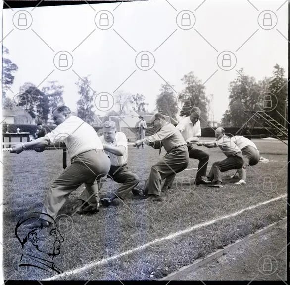 tävling, dragkamp, män, sport, gräs, lag, samarbete, utmaning, 1900-tal, svartvitt, kläder, nöje, utomhus, aktivitet, tradition, styrka, gemenskap, rolig, evenemang, historia