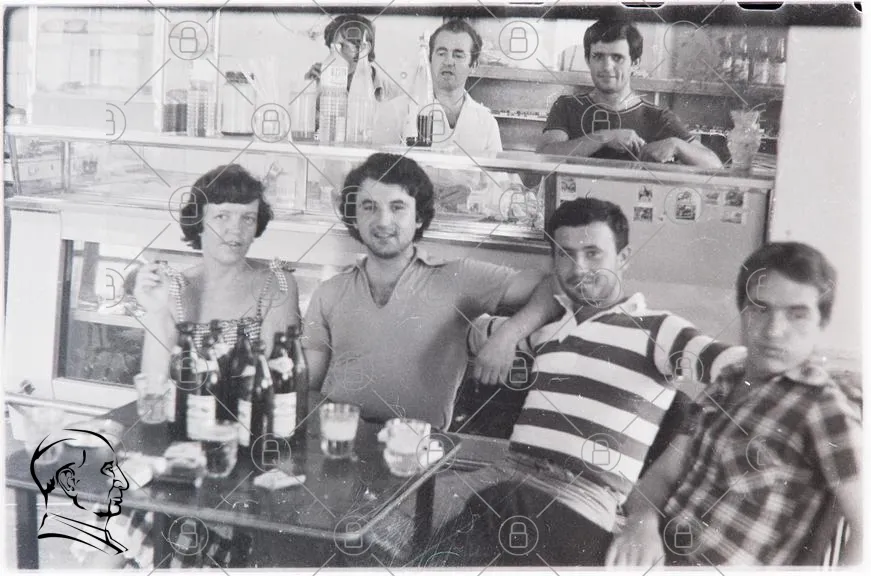 svartvit, foto, människor, bar, drycker, flaskor, bord, skratt, 1970-tal, retro, socialt, vänner, restaurang, kläder, frisyrer, glas, servering, personal, avslappnad, samvaro, nostalgisk, interiör, café, gruppbild, leenden, ungdomar, traditionell, fest, minnen, gemenskap