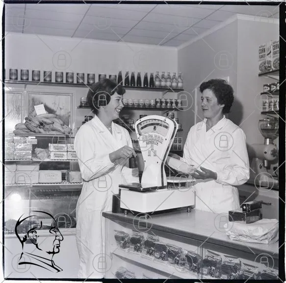 butik, kvinnor, våg, handel, retro, livsmedel, kläder, varor, leenden, 1950-tal, inredning, produkter, försäljning, service, skåp, hyllor, flaskor, förpackningar, skratt, arbete, professionella, tradition, kundservice, lokal, samhälle, gemenskap, vintage, svartvitt, fotografi, historia