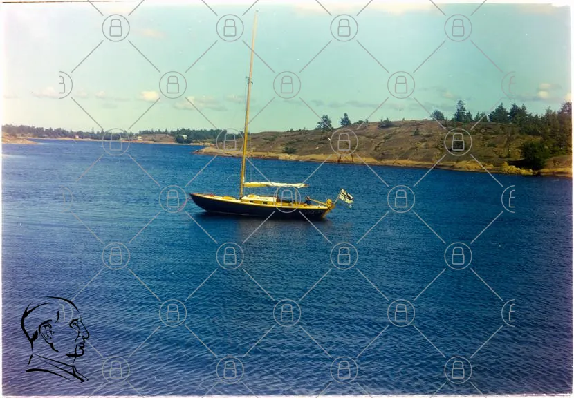 båt, segelbåt, vatten, hav, segel, landskap, natur, himmel, träd, klippor, sommar, fritid, segling, blått, gult, reflektion, kust, öar, stilla, lugnt