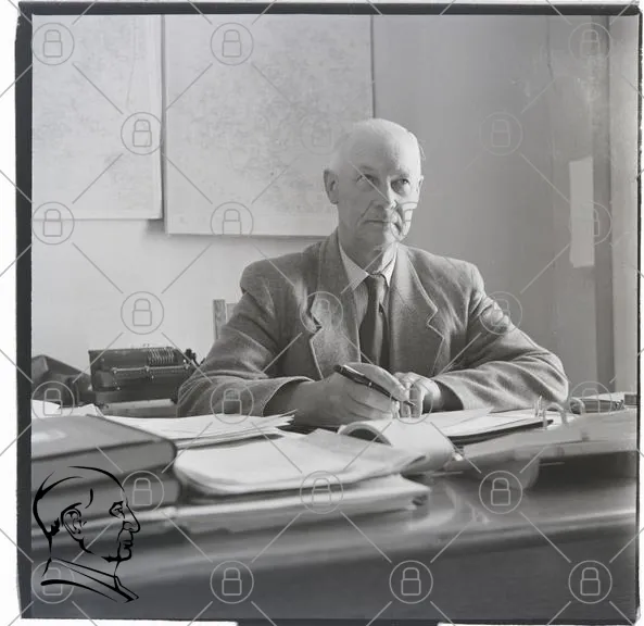 man, kontor, skrivbord, kartor, skrivmaskin, kostym, glasögon, svartvitt, dokument, papper, penna, professionell, 1900-tal, inomhus, affärsmann, fokus, äldre, kontorsmiljö, arbetsplats, seriös