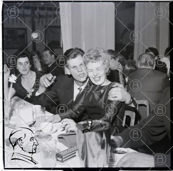 fest, middag, människor, leende, kläder, svartvitt, bord, glas, dekoration, 1950-tal, socialt, skratt, par, samvaro, festligheter, restaurang, retro, eleganta, kvinnor, män, interiör, nöje, gemenskap, minnen, fotografi, tradition, kultur, feststämning, glädje, samling