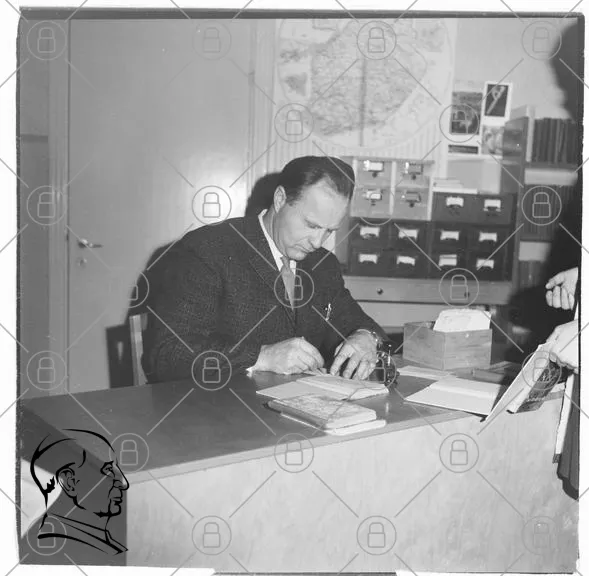 man, kontor, skrivbord, dokument, papper, kavaj, slips, möbler, svartvitt, 1900-tal, arbetsmiljö, kontorsarbete, kartor, lådor, interiör, professionell, affärsmann, retro, vintage, administration, fokus, ansikte, sittande, stående, kommunikation, samarbete, arbetsplats, organisation, historia