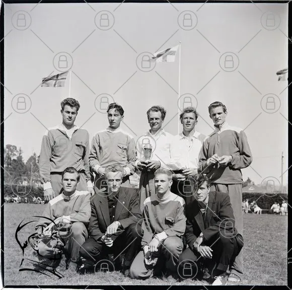 fotboll, lag, trofé, spelare, flaggor, gräs, svartvitt, 1950-tal, sport, gruppbild, ungdomar, seger, tävling, kläder, medaljer, historia, idrott, gemenskap, prestation, tradition, utomhus