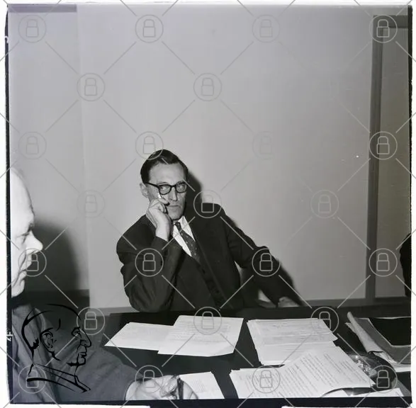 möte, bord, dokument, personer, svartvitt, kläder, glasögon, eftertänksam, skrivbord, papper, kontor, diskussion, 1900-tal, man, uttryck, professionell, inomhus, interiör, samtal, fokus