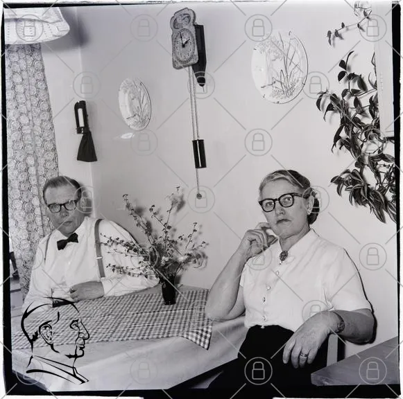 par, äldre, kök, bord, blommor, klocka, gardiner, glasögon, kläder, svartvitt, inredning, väggdekoration, duk, stolar, ansiktsuttryck, traditionell, hemtrevlig, samtal, stillhet, nostalgi, 1900-tal, interiör, familj, samvaro, fotografi, retro, kultur, livsstil, minnen