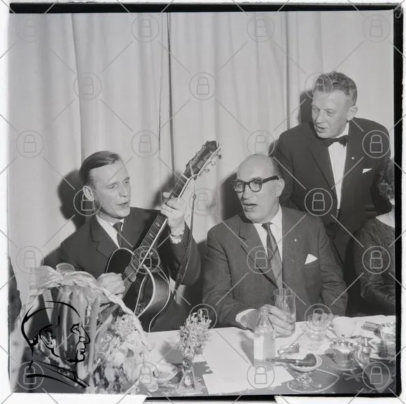 middag, musik, gitarr, sång, fest, kläder, män, kvinnor, glas, bord, blommor, svartvitt, underhållning, skratt, samvaro, 1950-tal, socialt, nöje, tradition, kultur, gemenskap