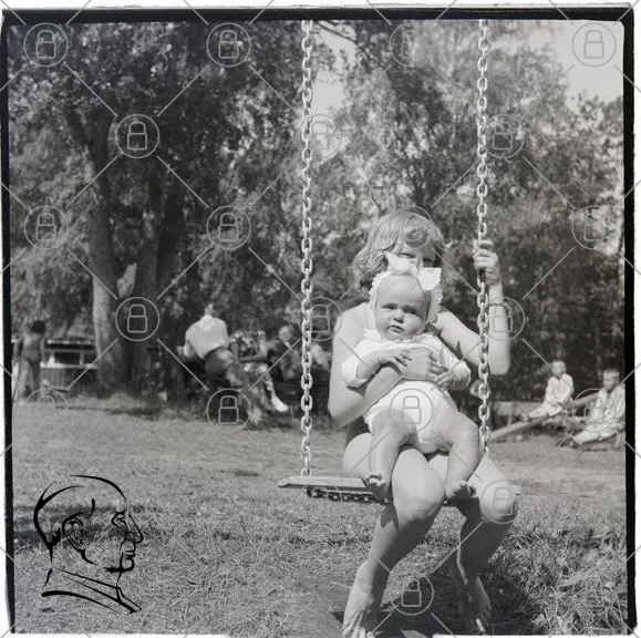 barn, gunga, sommar, lek, familj, utomhus, grönska, klänning, leende, baby, natur, minnen, 1950-tal, svartvitt, fotografi, glädje, vänskap, barnlek, avslappning, nöje, tradition, barndom, skratt, gemenskap, soligt, aktivitet, roligt, trygghet, kärlek, barntillbehör