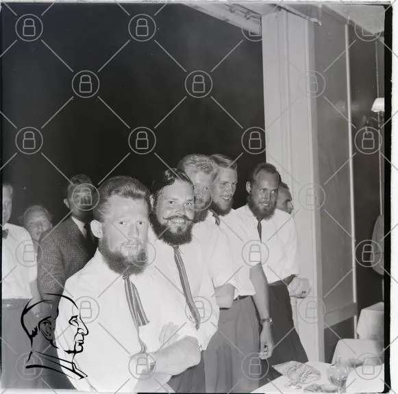 män, skägg, fest, kläder, svartvitt, 1950-tal, leende, samling, bord, mat, skjortor, slipsar, bakgrund, människor, traditionell, stil, fotografi, socialt, evenemang, nostalgi, interaktion, grupp, festligheter, ansikten, uttryck, gemenskap, tidsepok, klädsel, mänsklig, samvaro, minnen