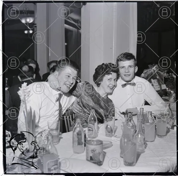fest, människor, bord, drycker, flaskor, leende, kläder, 1950-tal, sällskap, mat, dekorationer, glas, skratt, socialt, festligheter, svartvitt, retro, samvaro, glädje, evenemang, interiör, vänskap, familj, tradition, firande, feststämning, nostalgisk, minnen, samling, festlokal