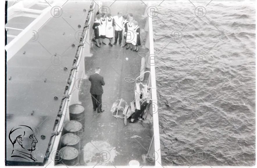 båt, människor, kläder, sjö, svartvit, 1940-tal, marin, grupp, arbete, hav, last, fartyg, kaj, interaktion, traditionell, uniform, fotografering, historisk, miljö, hamn, däck