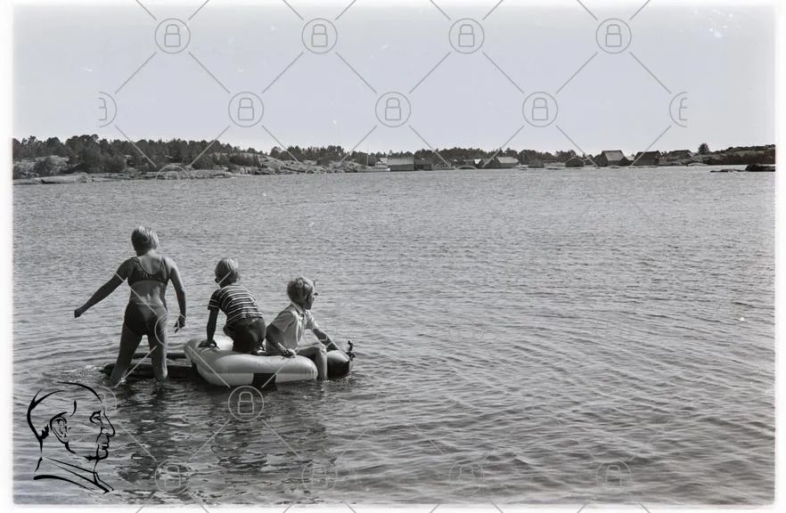 barn, båt, vatten, sommar, lek, strand, natur, familj, skärgård, bad, sol, fritid, rolig, minnen, svartvit