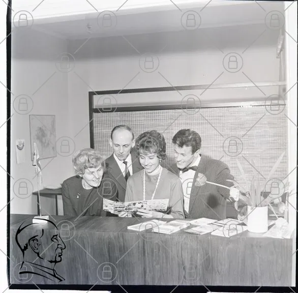 personer, reception, broschyrer, svartvitt, kläder, leende, kontor, 1960-tal, interiör, möte, information, vänskap, affärsmöte, dokument, tidningar, växter, professionell, socialt, samarbete, stil, vintage