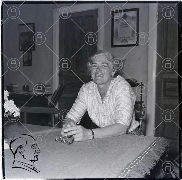 kvinna, leende, glasögon, bord, inomhus, rum, blommor, trä, väggar, dörr, svartvitt, vintage, heminredning, familj, tradition, sittande, kläder, interiör, fotografi, nostalgi, gammal, möbler, hem, livsstil, kultur, historia, person, ansikte, uttryck