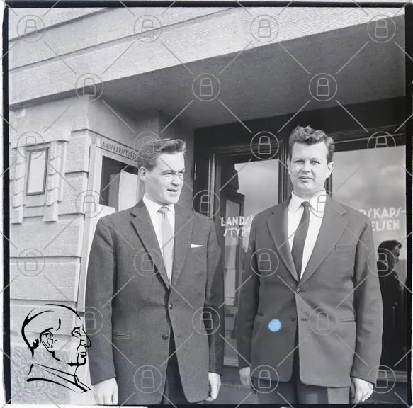 svartvit, män, kostymer, byggnad, fönster, 1960-tal, porträtt, affärsmän, stil, professionell, utomhus, Sverige, fotografi, historisk, möte, ansikten, kläder, formell, arkitektur, landskap, typografi, skyltar, samarbete, vänskap, affär, tradition, kultur, tidsepok