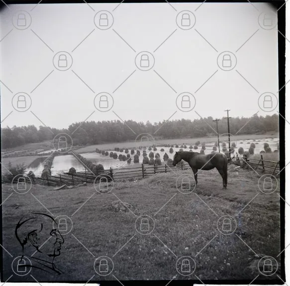 häst, landskap, åker, stängsel, träd, gräs, fält, natur, svartvit, betande, gård, landsbygden, vatten, högar, telefonstolpar, horisont, djur, sommar, lugn, idyll
