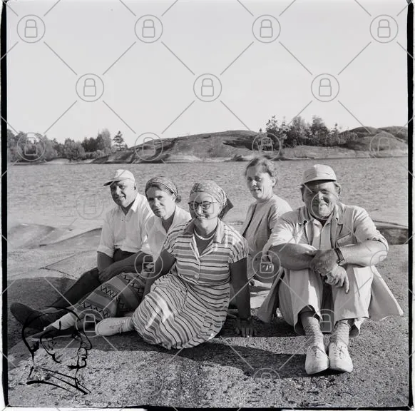 grupp, människor, klippor, sjö, sommar, svartvit, kläder, hattar, kvinnor, män, natur, landskap, fotografering, familj, vänner, avkoppling, tradition, 1900-tal, utomhus, leende