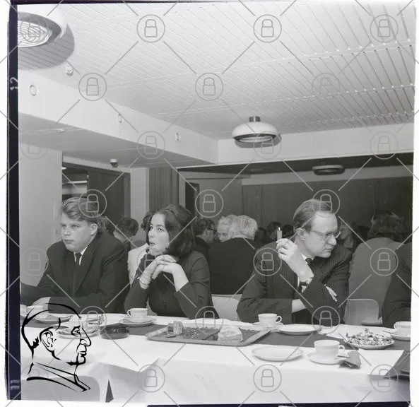 svartvit, fotografi, människor, bord, kaffe, te, kakor, kläder, 1960-tal, inomhus, möte, diskussion, stil, retro, interiör, belysning, ansiktsuttryck, socialt, samvaro, samtal, mat, dryck, sällskap, formell, evenemang, tradition, kultur, historia, grupp, sittande