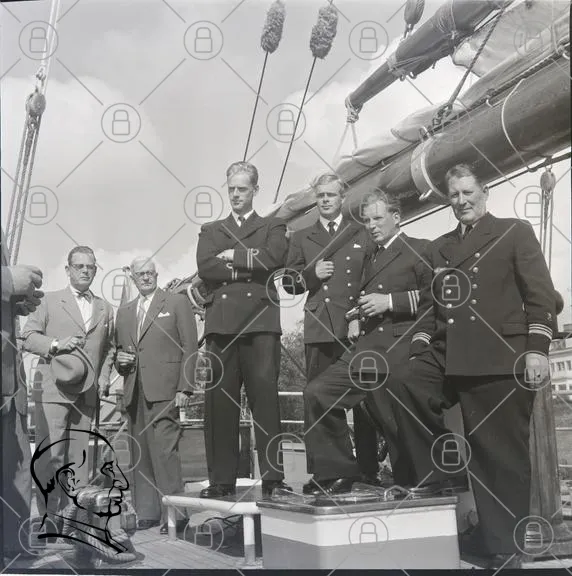skepp, män, uniformer, segelbåt, 1950-tal, svartvitt, marin, besättning, fotografering, hav, himmel, kläder, stil, tradition, grupp, porträtt, segling, nautisk, historia, sjöfart, vänner, samarbete, event, fest, segel, trä, båt, sjö, landskap, utomhus