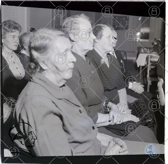 publik, kvinnor, äldre, samling, evenemang, sittande, ansikten, kläder, inomhus, svartvitt, uttryck, gemenskap, ålder, socialt, aktivitet, minnen, tradition, historia, samhörighet, diskussion, lyssna