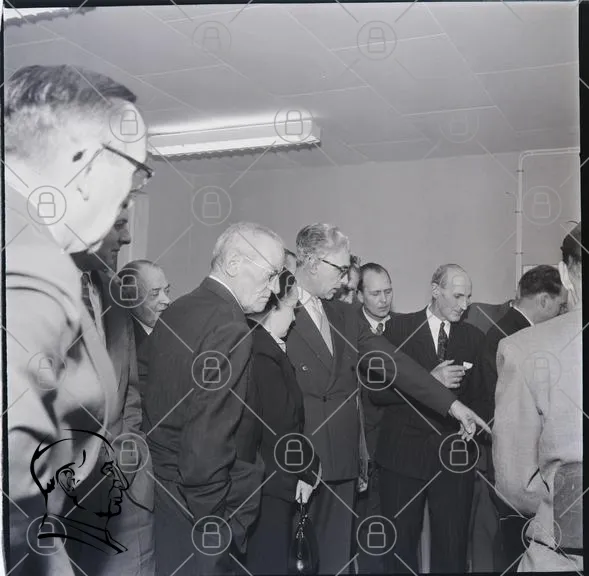 möte, män, kostymer, glasögon, diskussion, inomhus, svartvitt, 1950-tal, affärsmän, formell, samling, grupp, kontor, professionell, allvarlig, interaktion, ledarskap, presentation, teknik, historia