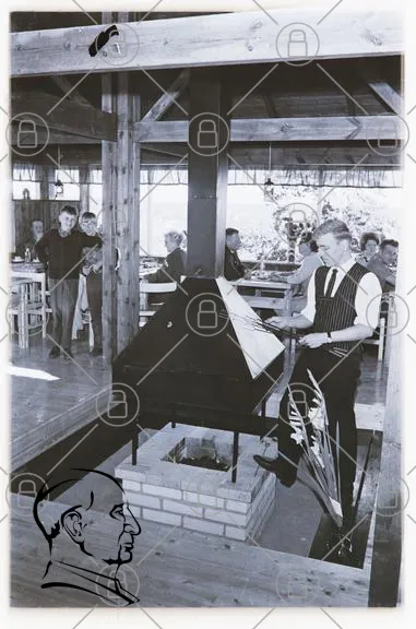 restaurang, servering, kock, matlagning, 1950-tal, svartvitt, inredning, gäster, bord, stolar, eldstad, personal, kläder, traditionell, växter, atmosfär, socialt, måltid, service, stil, interiör, vintage, upplevelse, mat, dryck, fest, samvaro, kultur, historia