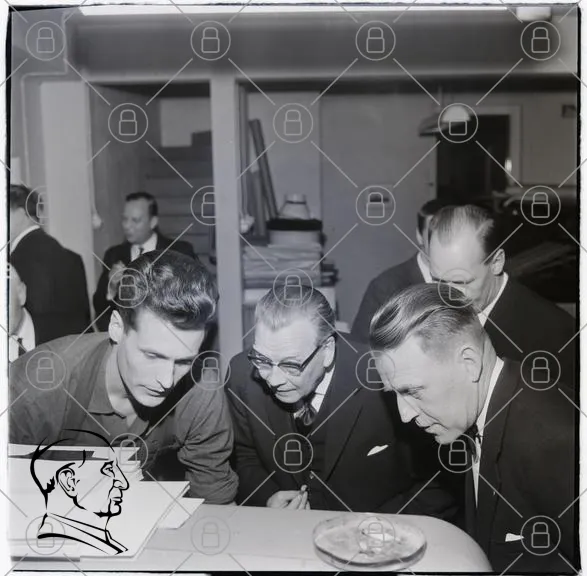 män, kontor, diskussion, 1940-tal, svartvitt, kläder, affärsmän, papper, dokument, samarbete, möte, inomhus, professionellt, ansikten, fokus, arbete, stil, retro, historiskt, grupp, interaktion, skrivbord, belysning, trappa, detaljer, uttryck, koncentration, affärsmiljö, traditionell, socialt