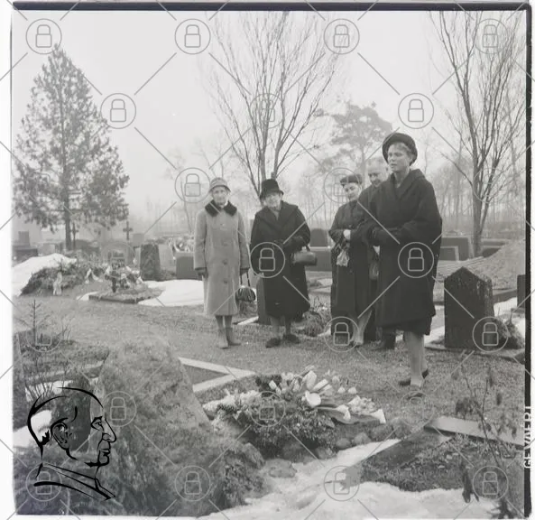 gravplats, kvinnor, begravning, träd, snö, blommor, sorg, minnesstund, svartvitt, kläder, hattar, gravstenar, kyrkogård, vinter, familj, tradition, respekt, minne, samling, stillhet