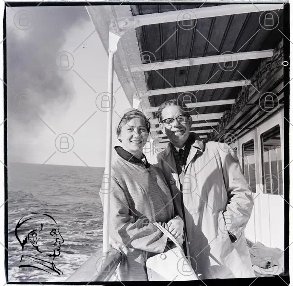 par, båt, hav, leende, jackor, utomhus, reling, svartvitt, resa, vatten, glada, man, kvinna, fartyg, däck