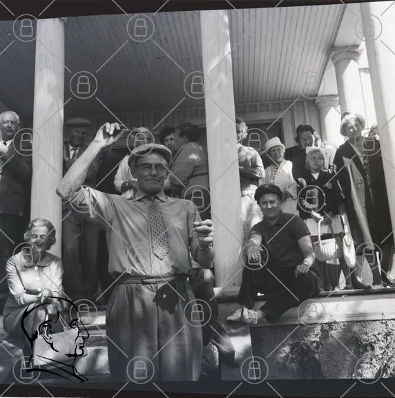 historisk, svartvit, grupp, människor, äldre, män, kvinnor, leende, kläder, hattar, trappa, byggnad, porträtt, samling, fest, glädje, tradition, 1900-tal, socialt, gemenskap, minnen, kultur, fotografering, utomhus, stil, nostalgi, ansikten, uttryck, samvaro