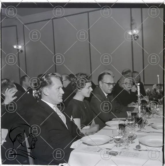 middag, fest, bord, gäster, kläder, man, kvinna, glas, tallrikar, servetter, leenden, samtal, 1950-tal, svartvitt, eleganta, belysning, dekoration, sällskap, evenemang, socialt, samling, restaurang, högtid, tradition, stil, artighet, uppvaktning, mat, dryck, atmosfär