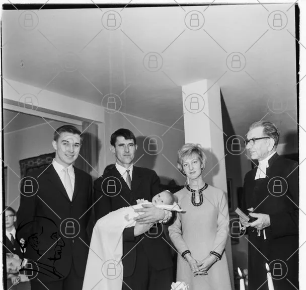 barn, dop, familj, vuxna, pojke, flicka, klänning, kostym, kyrka, ceremoni, 1960-tal, svartvitt, tradition, glädje, släkt, baby, fader, mor, präst, fest, minne, samling, kärlek, högtid, leende, kläder, barnvagn, fotografi, interiör
