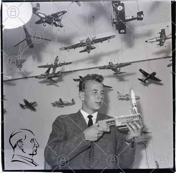 flygplan, modellflyg, pojke, 1950-tal, leksak, inomhus, hängande, samling, teknik, nostalgi, fotografi, svartvitt, hobby, detaljer, konstruktion, intresse, luftfart, utbildning, kreativitet, passion, historia