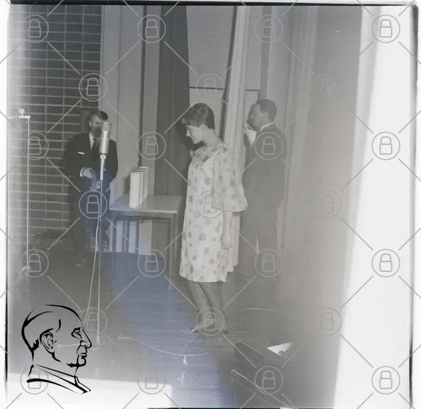 scen, mikrofon, kvinna, klänning, prickar, man, bakgrund, uppträdande, 1960-tal, svartvitt, publik, kläder, stående, musik, artist, föreställning, teater, ljus, skådespelare, scenografi, uttryck, koncentration, framträdande, stil, retro, vintage, kultur, evenemang, performance, ljud, atmosfär