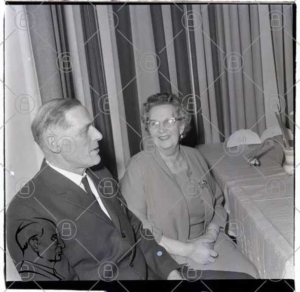 man, kvinna, kläder, kostym, glasögon, bord, duk, inredning, svartvitt, fest, leende, 1900-tal, porträtt, sällskap, möte, dekoration, växter, stolar, bakgrund, detaljer, ansikten, uttryck, samvaro, evenemang, tradition, stil, elegans, minnen, historia, socialt