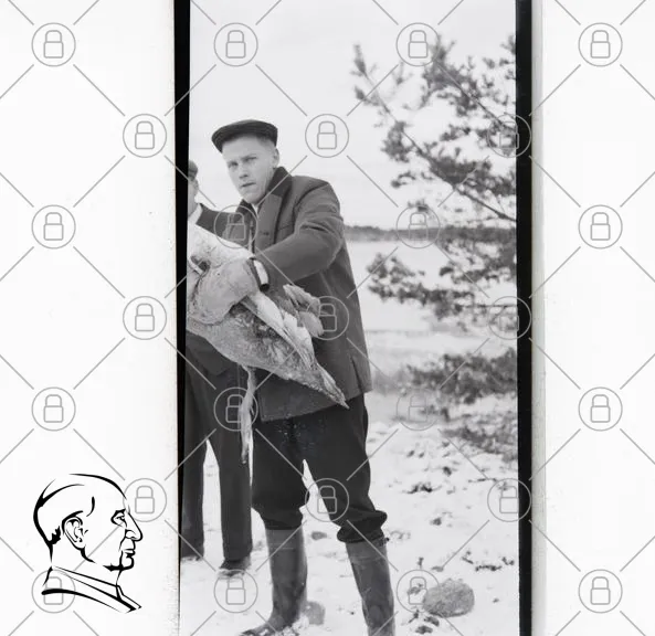 man, fisk, fångst, vinter, snö, sjö, kläder, gummistövlar, träd, svartvitt, natur, fiske, tradition, landskap, män, fiskeutrustning, fiskeplats, gammal, historia, utomhus, aktivitet, samling, porträtt, kust, miljö, hobby, kultur, sport, avkoppling, nöje