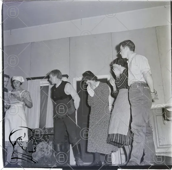 teater, skådespelare, kostymer, svartvitt, scen, 1900-tal, kläder, drama, föreställning, publik, uttryck, rekvisita, tradition, ungdomar, kvinna, man, roll, skådespel, historia, kultur, samspel, känslor, gest, interaktion, scenografi, uppträdande, teaterkonst, grupp, performance, konst