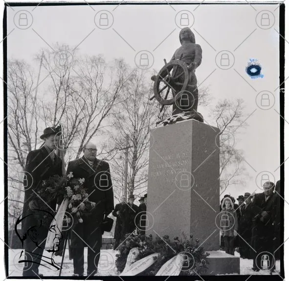 staty, monument, människor, vinter, snö, kransar, ceremoni, träd, himmel, skulptur, minnesmärke, kläder, hattar, text, sten, bas, publik, minne, hyllning, konstverk