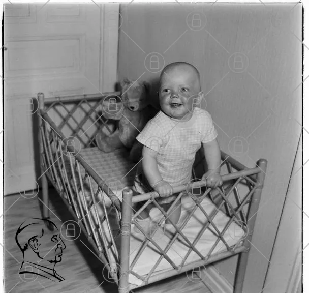 barn, spjälsäng, leksak, nallebjörn, leende, inomhus, svartvit, baby, möbler, rum, sömn, barndom, trygghet, glädje, familj, tidlös, retro, 1950-tal, barnrum, lek, skratt, mjukisdjur, stående, säng, barnkläder, interiör, nostalgi, hem, barnfotografi, sängkläder