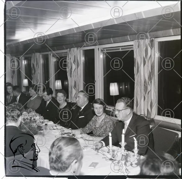 middag, fest, bord, gäster, ljus, dukning, klänningar, kostymer, fönster, dekoration, 1950-tal, svartvitt, elegans, samvaro, måltid, samtal, belysning, servetter, blommor, tallrikar, glas, bestick, atmosfär, socialt, tradition, stil, festligheter, interiör, nöje, gemenskap