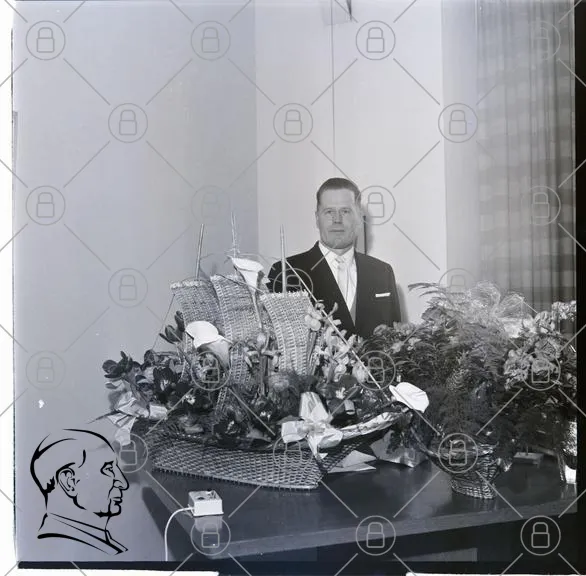 man, kostym, blommor, dekoration, bord, korgar, fest, inredning, svartvitt, fotografi, 1900-tal, stil, arrangemang, växter, present, snittblommor, bakgrund, fönster, klassisk, formell, evenemang, tradition, stilren, elegans, festlig, interiör, konst, hantverk, detaljer, presentation